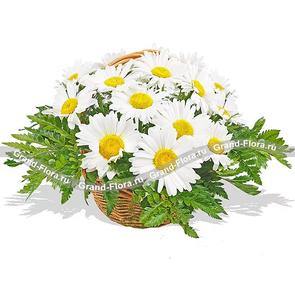 ЛЮКС: ромашка белая - 25 шт, аспарагус - 5 шт, папоротник - 7 шт, оазис, корзина.