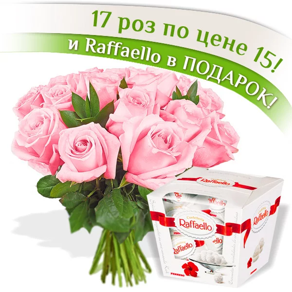 17 розовых роз + Raffaello