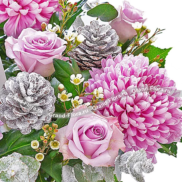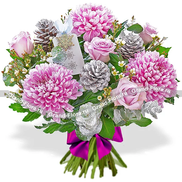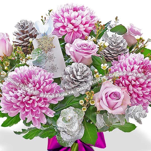 Стандартный: хризантема одноголовая фиолетовая - 4 шт., роза Аква - 3 шт., эвкалипт (декорированный серебром) - 2 шт., рускус - 3 шт., шишки (декорированные  серебром) - 2 шт., бант фиолетовый.