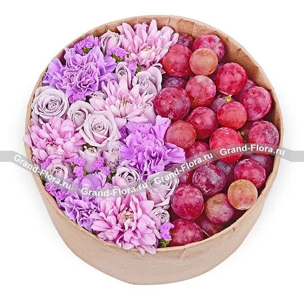 Стандартный: гвоздика фиолетовая - 2 шт., хризантема кустовая ромашковая фиолетовая - 1 шт., роза кустовая фиолетовая - 2 шт., статица, виноград - 1 кг., оазис, коробка.